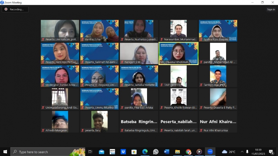 Acara dilaksanakan pada pukul 10.00 hingga 13.00 WIT. Webinar ini merupakan projek akhir dari Mata Kuliah Intervensi dalam Psikologi Islam pada mahasiswa semester 6 (enam) yang diampu Ibu Syafira Putri Ekayani, M.Psi., Psikolog. Webinar yang dibuka langsung oleh Kaprodi Psikologi Ibu Nengsih Sri Wahyuni, S.Sos., M.A., diikuti oleh peserta dari berbagai latar belakang diantaranya mahasiswa dari berbagai prodi di lingkungan UNIMUDA Sorong terkhusus mahasiswa Program Studi Psikologi UNIMUDA, dosen, dan umum. Pemateri dalam acara ini adalah Bapak Muh. Arif Rizqi, S.Psi., M.Psi., Psikolog yang merupakan Dosen Prodi Pendidikan dokter FKIK Universitas Muhammadiyah Yogyakarta yang ekspert dalam kajian Psikologi Islam. Pada kesempatan ini, nasasumber memaparkan bagaimana dampak muhasabah diri dalam kehidupan terkhusus sebagai bentuk self healing.