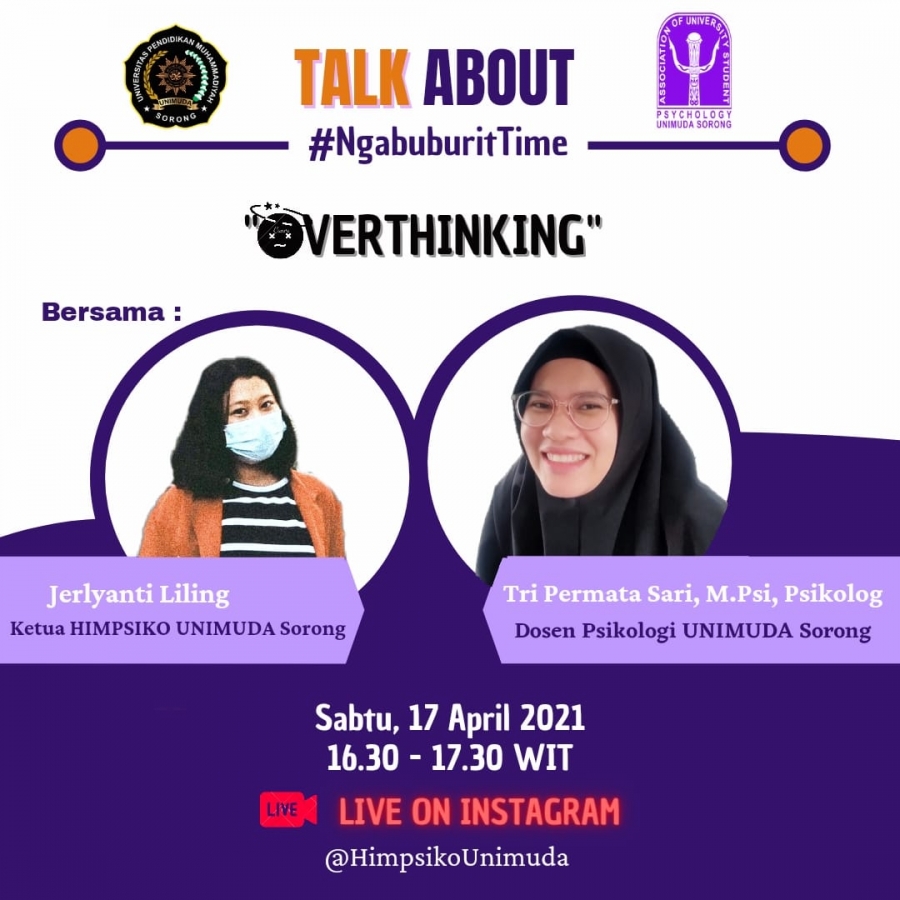 Kali ini dengan mengangkat topik seru yaitu mengenai “overthinking”, HIMPSIKO mengundang Ibu Tri Permata Sari, M.Psi, Psikolog yang merupakan salah satu Dosen Program Studi Psikologi di UNIMUDA untuk menjadi narasumber dalam pekan ini ditemani oleh Direktur HIMPSIKO, Jerliyanti Liling selaku moderator untuk membahas santai mengenai overthinking. Overthinking sendiri dalam istilahnya adalah perilaku memikirkan sesuatu yang dilakukan secara berlebihan. Hal ini bisa dipicu oleh adanya kekhawatiran individu pada suatu hal, mulai dari masalah ringan dalam kehidupan sehari-hari, masalah besar, hingga mungkin trauma yang terjadi di masa lalu, yang membuat tidak bisa berhenti untuk memikirkannya.