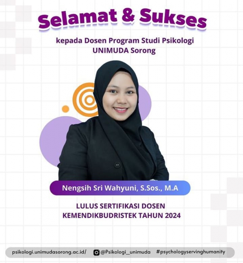 Sehubungan telah diumumkannya proses sertifikasi dosen tahun 2024 pada https://sister.kemdikbud.go.id, terdapat satu nama dosen Universitas Pendidikan Muhammadiyah Sorong, tepatnya dari Fakultas Ekonomi Bisnis dan Humaniora. Kabar Bahagia ini datang dari dosen program studi Psikologi yang sekaligus menjabat sebagai Kaprodi pada prodi yang sama yaitu Nengsih Sri Wahyuni, S.Sos., M.A. Dengan bertambahnya kelulusan ini memberikan penguatan serta bertambahnya dosen profesional pada Instansi UNIMUDA khususnya Program Studi Psikologi Fakultas Ekonomi Bisnis dan Humaniora.